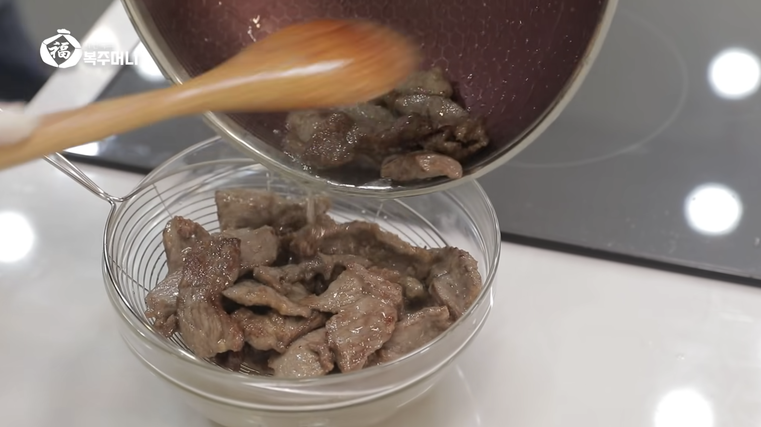 다 익은 고기는 채반에 걸러주세요.